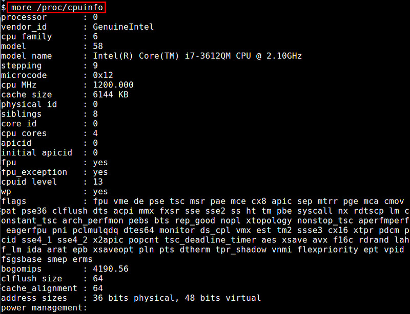 通过查看这个文件,你能识别出物理处理器数(插槽)、每个CPU核心数、可用的CPU标志寄存器以及其它东西的数量。