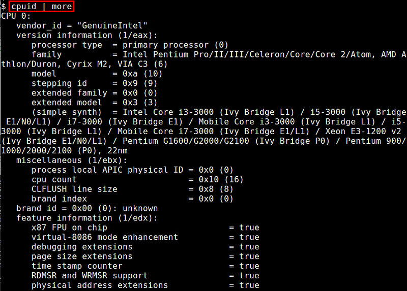 根据你的需要,有各种各样的关于你的CPU处理器信息你需要了解,比如CPU供应商名、模型名、时钟频率、插槽/内核的数量, L1/L2/L3缓存配置、可用的处理器能力(比如:硬件虚拟化、AES, MMX, SSE)等等。在Linux中,有许多命令行或基于GUI的工具就能来展示你的CPU硬件的相关具体信息。