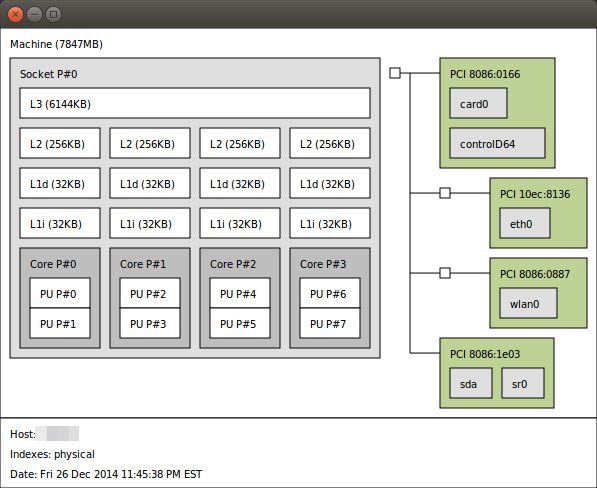lstopo命令 (包括在 hwloc 包中) 以可视化的方式组成 CPU、缓存、内存和I/O设备的拓扑结构。这个命令用来识别处理器结构和系统的NUMA拓扑结构。