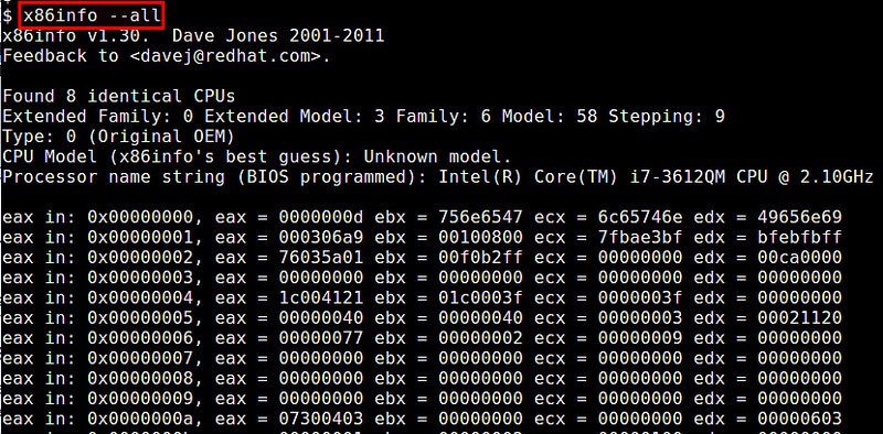 x86info是一个为了展示基于x86架构的CPU信息的命令行工具。信息报告包括CPU型号、线程/核心数、时钟速度、TLB(传输后备缓冲器)缓存配置、支持的特征标志寄存器等等。