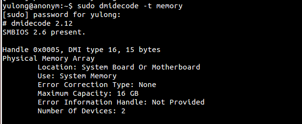 第一部分输出是概要信息,主要说板支持的最大内存是16GB,共有两个内存插槽。