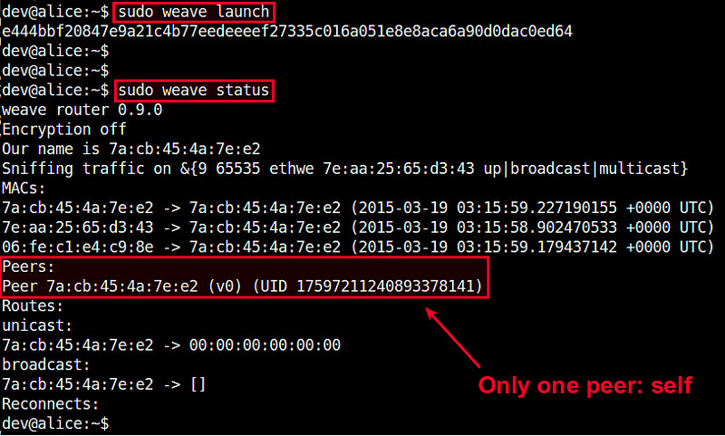 第一台宿主机,运行下面的命令,就会创建并开启一个 weave 路由器容器(LCTT 译注:前面说过了,weave 路由器也是一个容器):