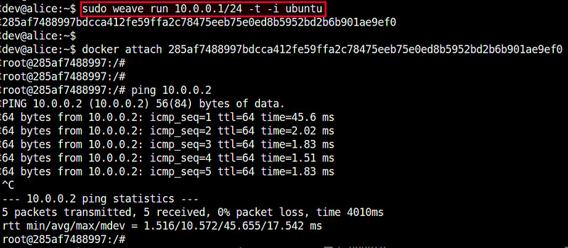 $ sudo weave run 10.0.0.2/24 -t -i ubuntu