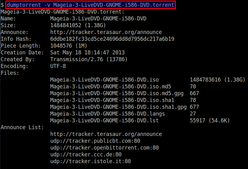 要查看torrent的完整内容,请添加“-v”选项。它会打印更多关于torrent的详细信息,包括信息散列、片长度、创建日期、创建者,以及完整的声明列表。