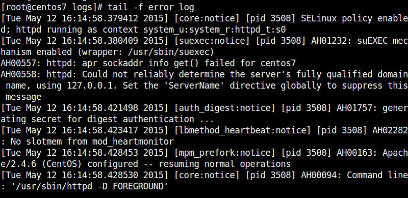 结合上面的两个指令,可以获得完整的错误日志路径,默认情况下该路径就是 /etc/httpd/logs/errorlog。在全新安装的Apache中,这是一个到 /var/log/httpd/errorlog 的符号链接。