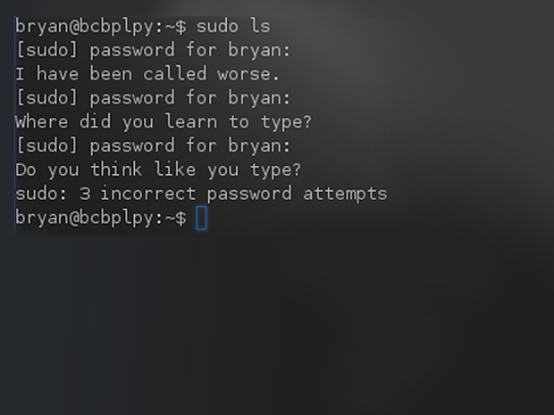 “我刚才对电脑做了什么?”你可能这样问自己。一定是美妙的事情吧。现在,在sudo命令提示提示下输出错误的口令,你的电脑就会指责你。我最喜欢的一句:“听好了,煎饼一样的脑子,我没有时间听你胡说八道了。”