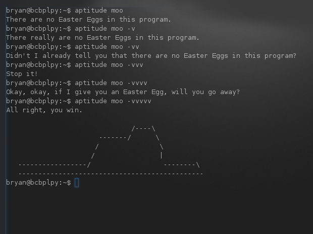 更有趣的是将moo应用到aptitude上。敲入aptitude moo(在Ubuntu及其衍生版),你对moo可以做什么事情的看法会有所变化。你还还会知道更多事情,尝试重新输入这条命令,但这次添加一个-v参数。这还没有结束,试着添加更多v,一次添加一个,直到抓狂的aptitude给了你想要的东西。