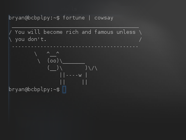 aptitude moo的输出格式很漂亮,但我想你苦于不能自由自在地使用。输入cowsay,它会做到你想做的事情。你可以让牛说任何你喜欢的东西。而且不只可以用牛,还可以用Calvin、Beavis和Ghostbusters logo的ASCII的艺术,输入cowsay -l可以得到所有可用的参数。它是Linux世界的强大工具。像很多其他命令一样,你可以使用管道把其他程序的输出输送给它,比如fortune | cowsay,让这头牛变成哲学家。
