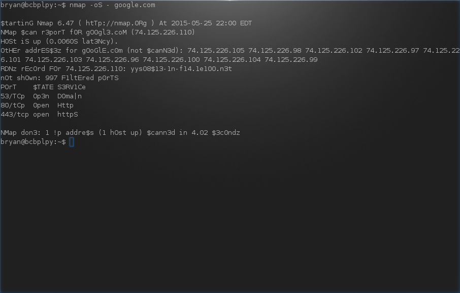 nmap并不是我们平时经常使用的基本命令。但如果你想蹂躏nmap的话,比如像人一样看起来像l33t。在任何nmap命令后添加-oS(比如nmap -oS - google.com)。现在你的nmap已经处于标准叫法是“脚本玩具模式”的模式了。Angelina Jolie和Keanu Reeves会为此骄傲的。