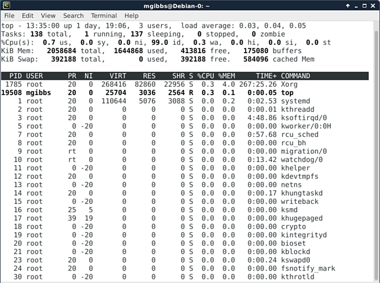 作为Linux系统监控工具中比较易用的一个,top命令能带我们一览Linux中的几乎每一处。以下这张图是它的默认界面,但是按“z”键可以切换不同的显示颜色。其它热键和命令则有其它的功能,例如显示概要信息和内存信息(第四行第二个),根据各种不一样的条件排序、终止进程任务等等(你可以在这里找到完整的列表)。