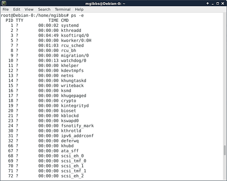 ps命令展现的是正在运行中的进程列表。在这种情况下,我们用“-e”选项来显示每个进程,也就是所有正在运行的进程了(我把列表滚动到了前面,否则列名就看不到了)。这个命令有很多选项允许你去按需格式化输出。只要使用上述一点点的正则表达式技巧,你就能得到一个强大的工具了。猛戳这里获取更多信息。
