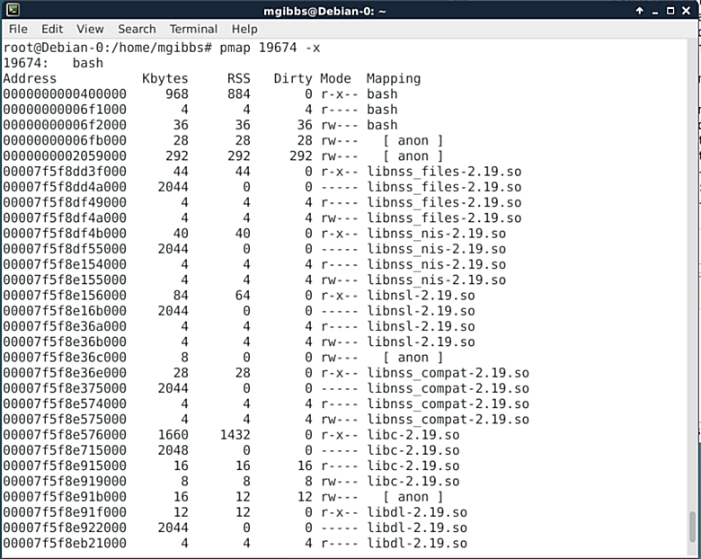 在调试过程中,理解一个应用程序如何使用内存是至关重要的,而pmap的作用就是当给出一个进程ID时显示出相关信息。上面的截图展示的是使用“-x”选项所产生的部分输出,你也可以用pmap的“-X”选项来获取更多的细节信息,但是前提是你要有个更宽的终端窗口。