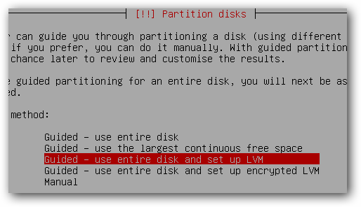 使用LVM首先要了解的一件事是,没有一个简单的方法可以将已有的传统分区转换成逻辑卷。可以将数据移到一个使用LVM的新分区下,但是这并不会在本篇中提到;在这里,我们将全新安装一台Ubuntu 10.10来设置LVM。(LCTT 译注:本文针对的是较老的版本,新的版本已经不需如此麻烦了)
