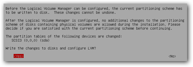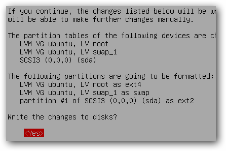 最后一步将GRUB的bootloader写到磁盘中。重点注意的是GRUB不能作为一个LVM分区因为计算机BIOS不能直接从逻辑卷中读取数据。Ubuntu将自动创建一个255MB的ext2分区用于bootloder。
