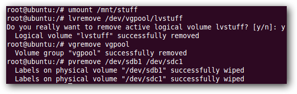 如果你想从卷组中移除一个硬盘驱动你可以按照上面的步骤反向操作,并用 lvreduce 或 vgreduce 命令代替。