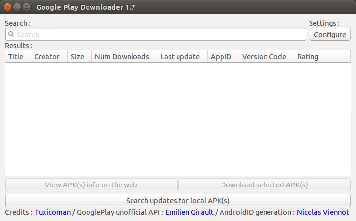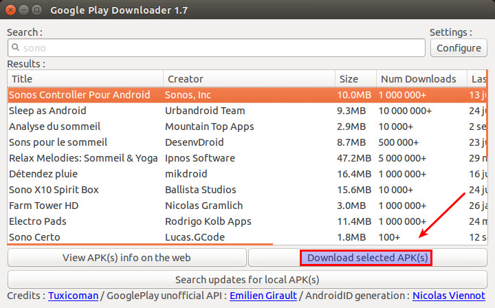 一旦你安装好 GooglePlayDownloader 后,你就可以像下面那样从 Google Play 商店下载 APK 文件。(LCTT 译注:显然你需要让你的 Linux 能爬梯子)