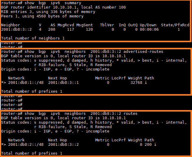 正如我们在上面看到的输出信息那样,路由间通告了他们完整的/48 IPv6前缀。出于演示的目的,我们会考虑以下要求。