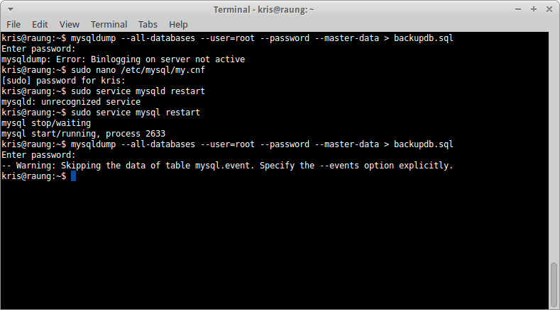 $ mysqldump --all-databases --user=root --password --master-data > backupdb.sql
