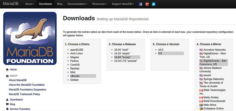 MariaDB 网站 提供了一个在线工具帮助你依据你的 Linux 发行版中来添加 MariaDB 的官方仓库。此工具为 openSUSE, Arch Linux, Mageia, Fedora, CentOS, RedHat, Mint, Ubuntu, 和 Debian 提供了 MariaDB 的官方仓库.