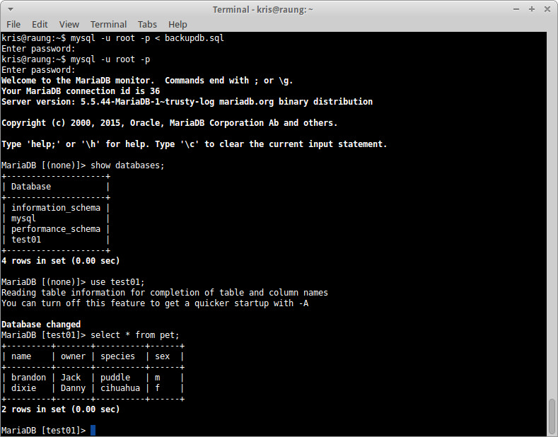 要检查导入过程是否完全成功,请登录到 MariaDB 服务器,并查看一些样本来检查。