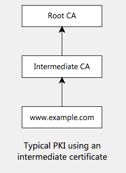 然而,终端证书很少会由根证书进行签名。相反的,终端证书是由一个“ 中间证书 ( intermediate certificate ) ”(有时候也称之为 下级 CA ( subordinate CA ) )进行签名的,而中间证书则由根证书进行签名。