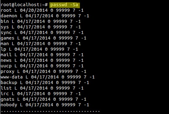 为了显示所有用户密码的状态信息需要使用 “-aS”选项在passwd 命令中,示例如下所示: