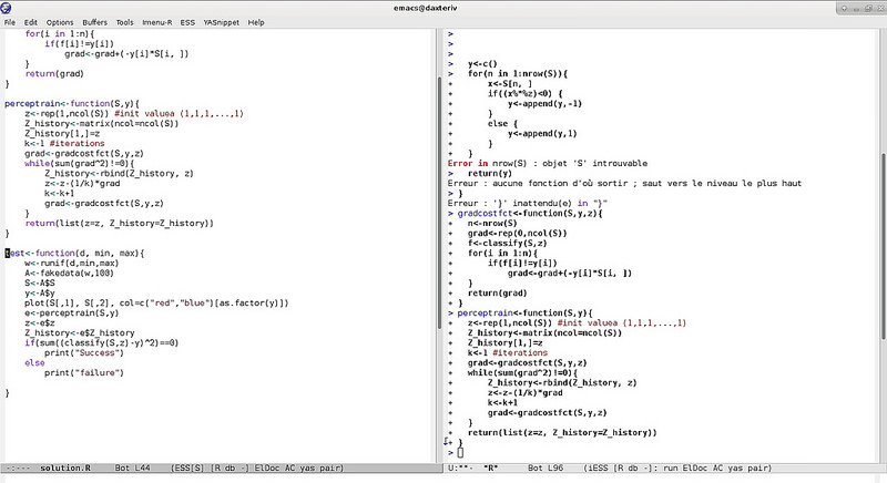 在我的前一个有关 IDE 的文章中,很多朋友对我所给出的清单中没有 Emacs 而感到失望。对于这个,我的主要理由是 Emacs 可以说是 IDE 里面的“通配符”:你可以将它放到任意语言的 IDE 清单中。但对于 带有 ESS 插件的 R 来说,事情就变得有些不同了。Emacs Speaks Statistics (ESS) 是一个令人惊异的插件,它将完全改变你使用 Emacs 编辑器的方式,真的非常适合 R 编程者的需求。与 RStudio 类似,带有 ESS 的 Emacs 拥有多视图,它有两个面板:一个显示代码,另一个则是一个 R 控制台,使得实时地测试代码和探索数据对象变得更加容易。但 ESS 真正的长处是可以和你已安装的其他 Emacs 插件无缝集成,以及它的高级配置选项。简而言之,如果你喜欢你的 Emacs 快捷键,你将能够在 R 语言开发环境下使用它们。然而,当你在 ESS 中处理大量数据时,我已经听闻并经历了一些效率低下的问题。尽管这个问题不是很重大,但足以让我更偏好 RStudio。