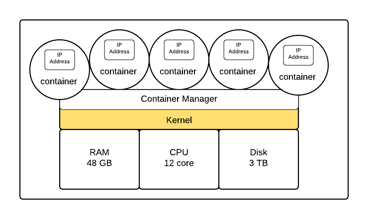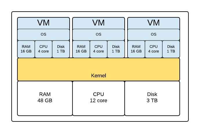 这里没有资源的流动。每台虚拟机拥有分配给它的所有资源。因此,在某种方式上我们又回到了虚拟机之前,把大部分金钱花费在未使用的资源上。