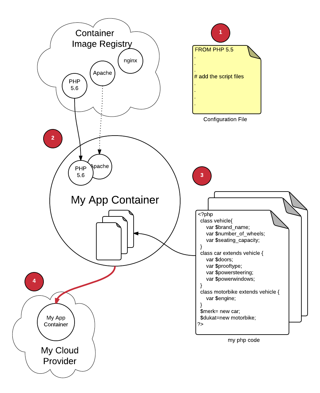 (1)代表一个定义了你容器所需东西以及你容器如何构建的容器配置文件。当你在主机上运行容器时,容器管理器会读取该配置文件,从云上的注册库中获取你需要的容器镜像,(2)将镜像作为层添加到你的容器中。
