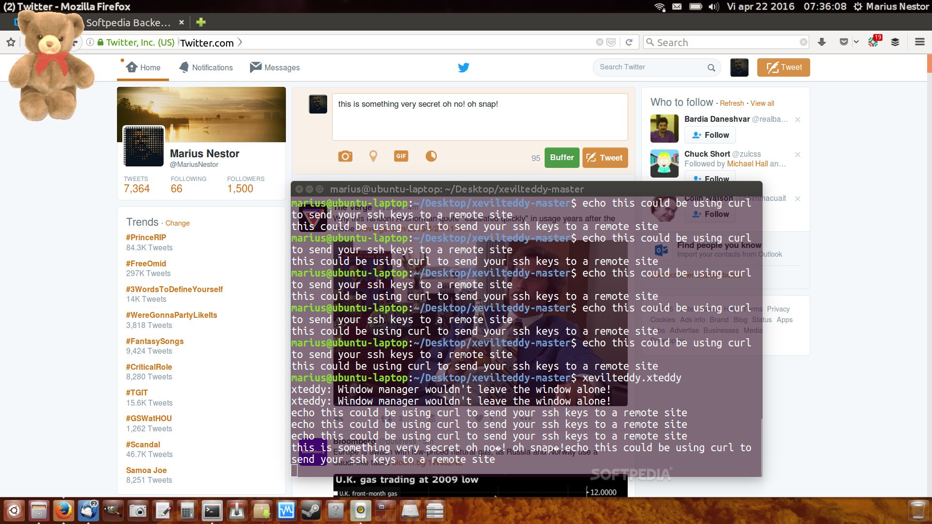 “我做了一个快速的概念验证,从 git 上获取了 XEvilTeddy,安装 Snapcraft (它在 16.04 中), 用 snapcraft 制作 snap,然后运行 sudo snap install xevilteddy*.snap,接着执行 /snap/bin/xevilteddy.xteddy。这是一个可爱的泰迪熊,真萌~ 现在打开 Firefox 并输入东西,然后去看看你的终端窗口。哦,天哪,我的小秘密呢… 再开一个终端窗口,然后将输入焦点放到其上,哦,我的天,一个被劫持的命令,它被替换成一个 curl 会话,可以上传你的 SSH 私钥到鬼才知道的某个地方。”