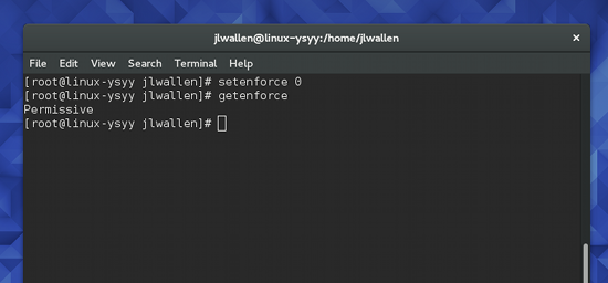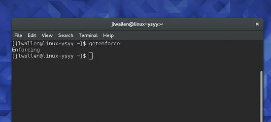 默认情况下,大部分系统的 SELinux 设置为 Enforcing。你要如何知道你的系统当前是什么模式?你可以使用一条简单的命令来查看,这条命令就是 getenforce。这个命令用起来难以置信的简单(因为它仅仅用来报告 SELinux 的模式)。要使用这个工具,打开一个终端窗口并执行 getenforce 命令。命令会返回 Enforcing、Permissive,或者 Disabled(见上方图 1)。