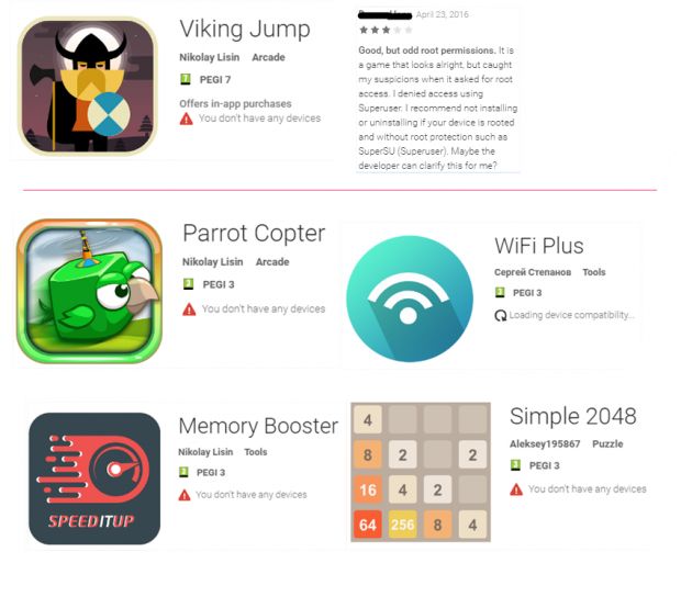 在 Google 的 Play 市场中发现了一个名为 Viking Horde 的高危木马,它已经在五个应用中发现:Viking Jump、Parrot Copter、WiFi Plus、Memory Booster 和 Simple 2048。感染该木马的设备可以被攻击者利用来进行点击欺诈、发送短信甚至发起 DDoS 攻击。这些应用虽然已被 Google 清除,但是安全研究人员称,同样的手法可以绕过 Google 的应用审查过程,所以将来还有可能出现更多的含有该木马的应用。
