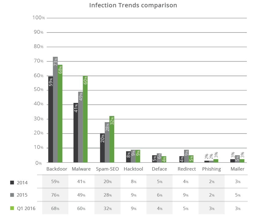 与去年相比,后门脚本比例略有降低,SEO 垃圾有小幅提升,而恶意软件感染则相较前些年增幅最大,从 2014 年的 41% 增加到了 2016 年的 60%!作为对比,后门脚本则从2014年的 59% 到 2015 年的 73%,现在回落到 68%;SEO 垃圾从 20% 到 28%,到了2016 年就增加到了 28%。