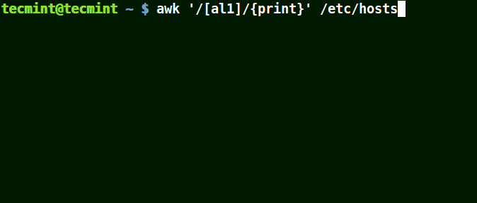 以集合 [al1] 为例,awk 将匹配文件 /etc/hosts 中所有包含字符 a 或 l 或 1 的字符串。