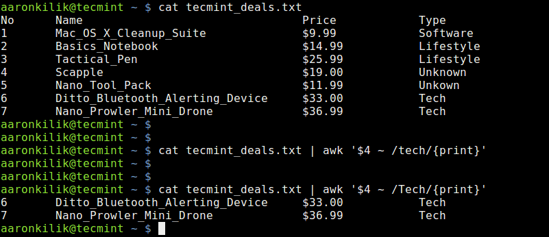 # cat tecmint_deals.txt | awk '$4 ~ /Tech/{print}'