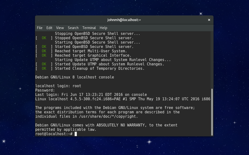$ systemd-nspawn -bD ~/DebianJessie