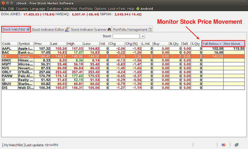 使用 JStock 你可以创建一个或多个监视列表,它可以自动的监视股票价格的波动并给你提供相应的通知。在每一个监视列表里面你可以添加多个感兴趣的股票进去。之后在“Fall Below”和“Rise Above”的表格里添加你的警戒值,分别设定该股票的最低价格和最高价格。