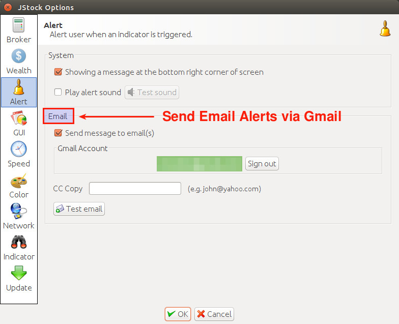 你也可以设置邮件通知,这样你将收到一些价格信息的邮件通知。设置邮件通知在“Options”菜单里,在“Alert”标签中国,打开“Send message to email(s)”,填入你的 Gmail 账户。一旦完成 Gmail 认证步骤,JStock 就会开始发送邮件通知到你的 Gmail 账户(也可以设置其他的第三方邮件地址)。