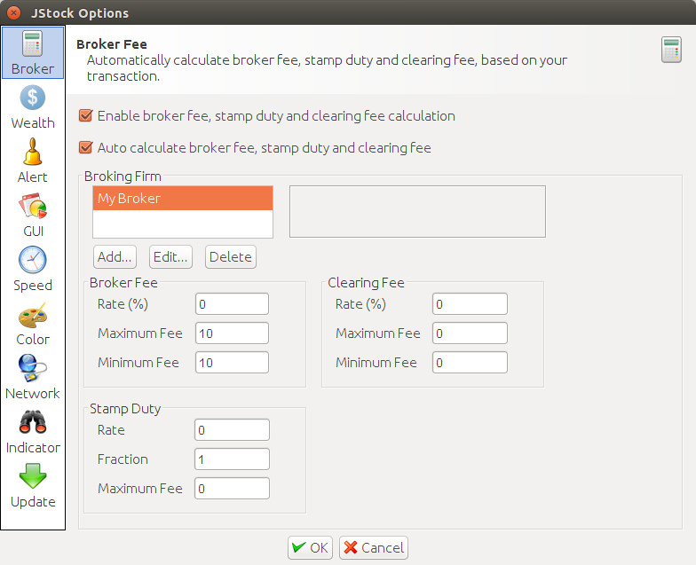 你也可以设置付给中介费,你可以为每个买卖交易设置中介费、印花税以及结算费。如果你比较懒,你也可以在选项菜单里面启用自动费用计算,并提前为每一家经济事务所设置费用方案。当你为你的投资组合增加交易之后,JStock 将自动的计算并计入费用。