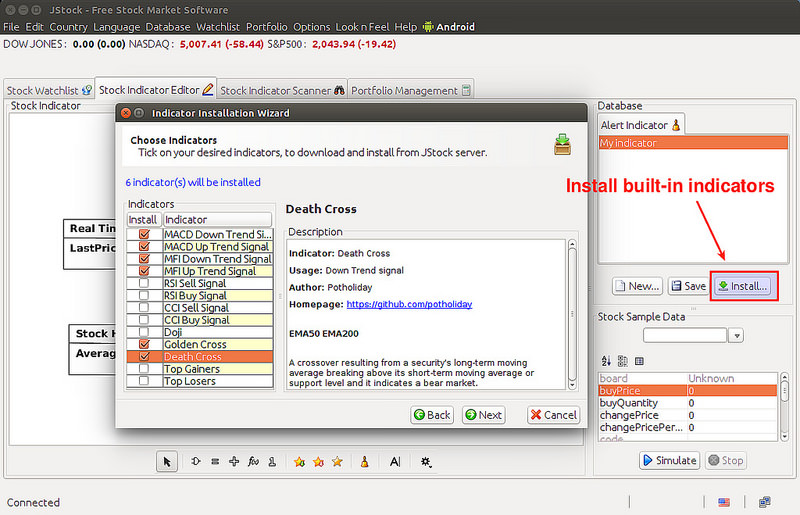 开启预设指示器能需要在 JStock 中点击“Stock Indicator Editor”标签。之后点击右侧面板中的安装按钮。选择“Install from JStock server”选项,之后安装你想要的指示器。
