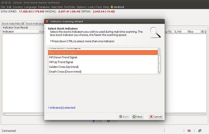 一旦安装了一个或多个指示器,你可以用他们来扫描股票。选择“Stock Indicator Scanner”标签,点击底部的“Scan”按钮,选择需要的指示器。