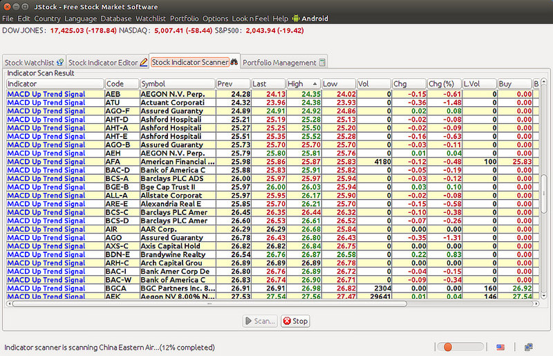 当你选择完需要扫描的股票(例如, NYSE, NASDAQ)以后,JStock 将执行该扫描,并将该指示器捕获的结果通过列表展现。