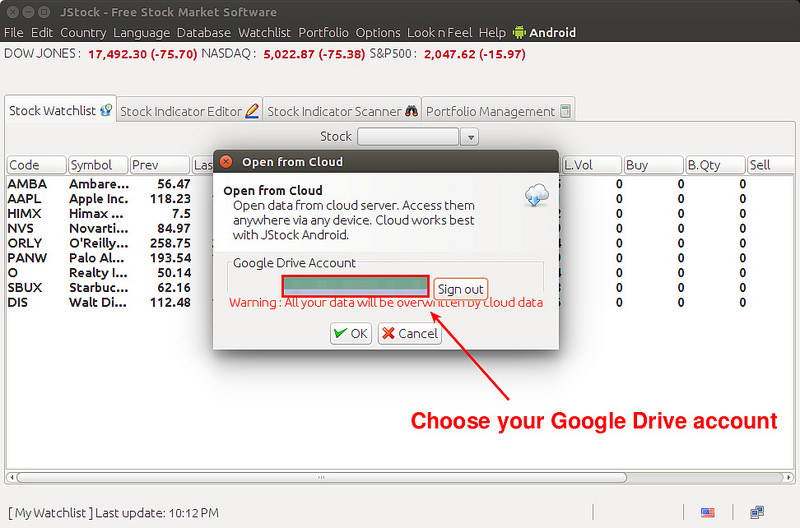 另一个非常棒的功能是 JStock 支持云备份恢复。Jstock 可以通过 Google Drive 把你的投资组合/监视列表在云上备份和恢复,这个功能可以实现在不同平台上无缝穿梭。如果你在两个不同的平台之间来回切换使用 Jstock,这种跨平台备份和还原非常有用。我在 Linux 桌面和 Android 手机上测试过我的 Jstock 投资组合,工作的非常漂亮。我在 Android 上将 Jstock 投资组合信息保存到 Google Drive 上,然后我可以在我的 Linux 版的 Jstock 上恢复它。如果能够自动同步到云上,而不用我手动地触发云备份/恢复就更好了,十分期望这个功能出现。