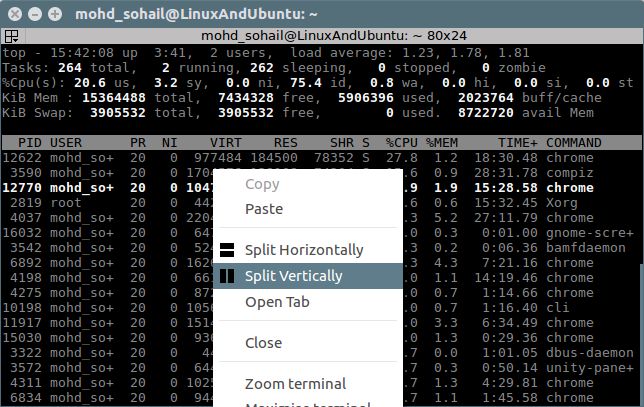 安装好 Terminator 之后,你可以简单的在一个窗口打开多个终端。只需要右键点击并切分。