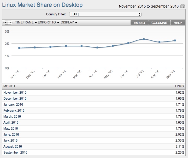 据 Net Market Share 的数据,全球的 Linux 桌面用户的份额已经连续四个月超过了 2% 。