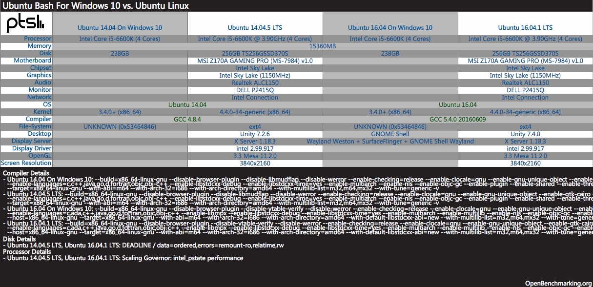 Windows 的 Linux 子系统测试完成了所有测试,并随着 Windows 10周年更新放出。 默认的 Ubuntu 用户空间还是 Ubuntu 14.04,但是已经可以升级到 16.04。所以测试首先在 14.04 测试,完成后将系统升级升级到 16.04 版本并重复所有测试。完成所有基于 Windows 的 Ubuntu 子系统测试后,我在同样的系统上干净地安装了 Ubuntu 14.04.5 和 Ubuntu 16.04 LTS 来做性能对比。