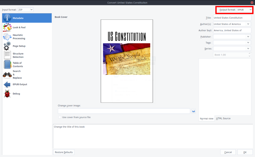 一旦这个 HTML 文件加入到 Calibre 库中,选择这个新文件并且点击“ 编辑元数据 ( Edit Metadata ) ”按钮。在这里,你可以添加下面的这些信息: 标题 ( Title ) 、 作者 ( Author ) 、 封面图片 ( cover image ) 、 描述 ( description ) 和其它的一些信息。当你填完之后,点击“Ok”。