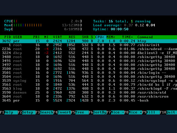 可以使用 htop。与 top 相似,但更好用、更美观。有时候,我打开 htop 之后就让它一直运行。没有原因,就是喜欢!从某方面说,它就像将音乐可视化——当然,这里显示的是 RAM 和 CPU 的使用情况。