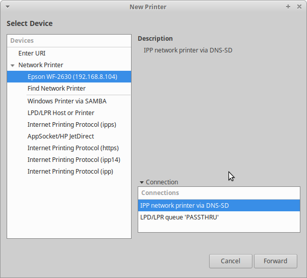我有一个爱普生 WF-2630 无线打印机。 Xubuntu 能够直接找到这台打印机,并安装相关驱动。