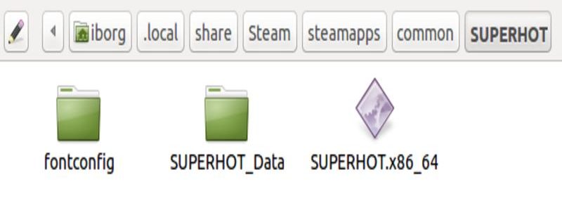 这是 Linux 平台上 Steam 游戏的默认安装位置。 .local 和 .steam 目录默认情况下是不可见的,你必须将它们显现出来。我们将推荐使用一个自定义的 Steam 安装位置以便更容易地处理这些文件。这里 SUPERHOT.x86_64 是 Linux 下原生的可执行文件,与 Windows 中的 .exe 文件类似。